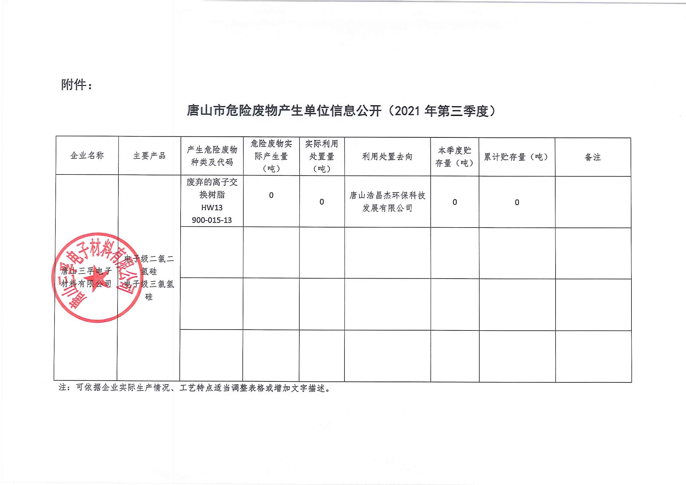 唐山三孚電子材料有限公司 危險廢物 三季度信息公開
