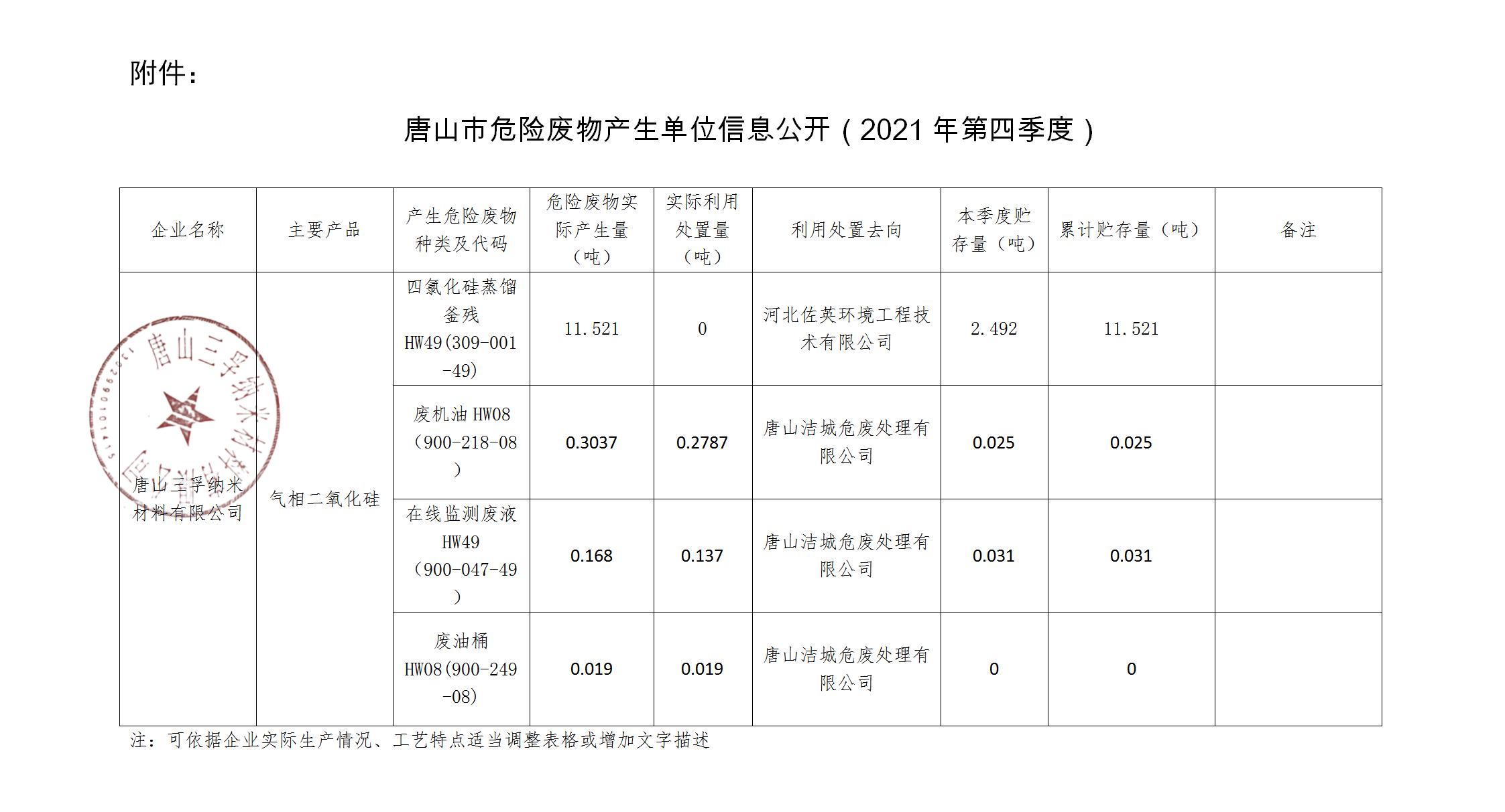 唐山三孚納米材料有限公司2021年四季度危險廢物廢物信息公開