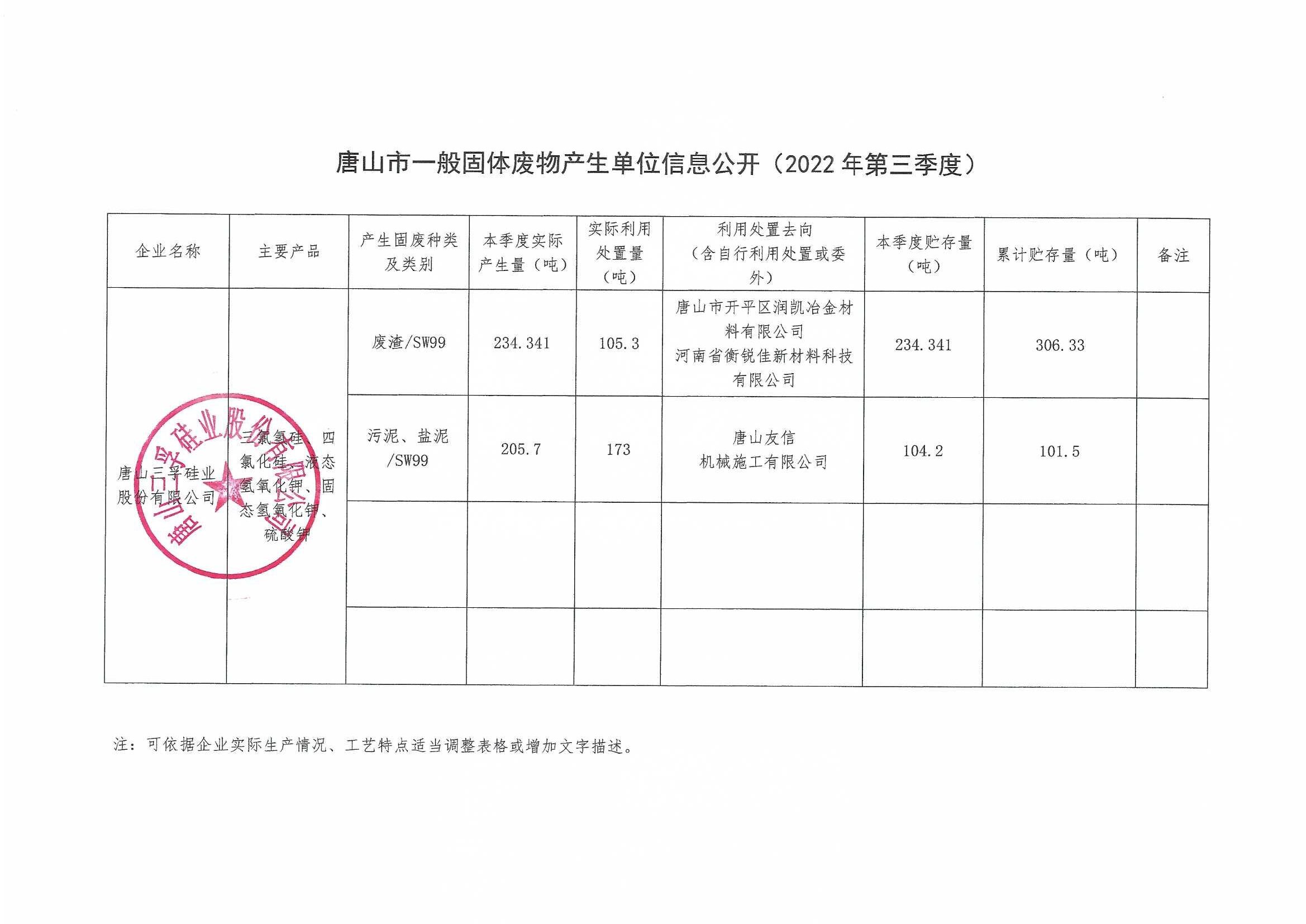 唐山三孚硅業股份有限公司2022年第三季度一般固體廢物信息公開