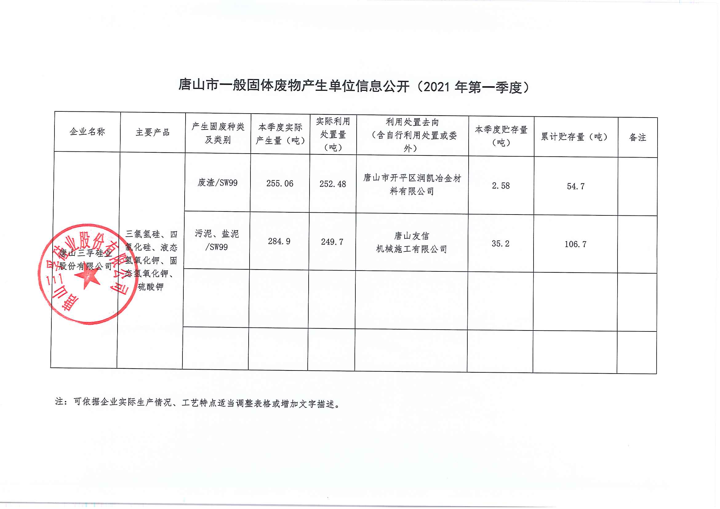 唐山三孚硅業股份有限公司2021年1季度 一般固體廢物產生單位信息公開