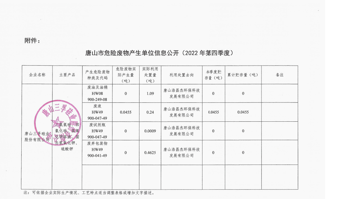 唐山三孚硅業股份有限公司2022年第四季度危險廢物信息公開
