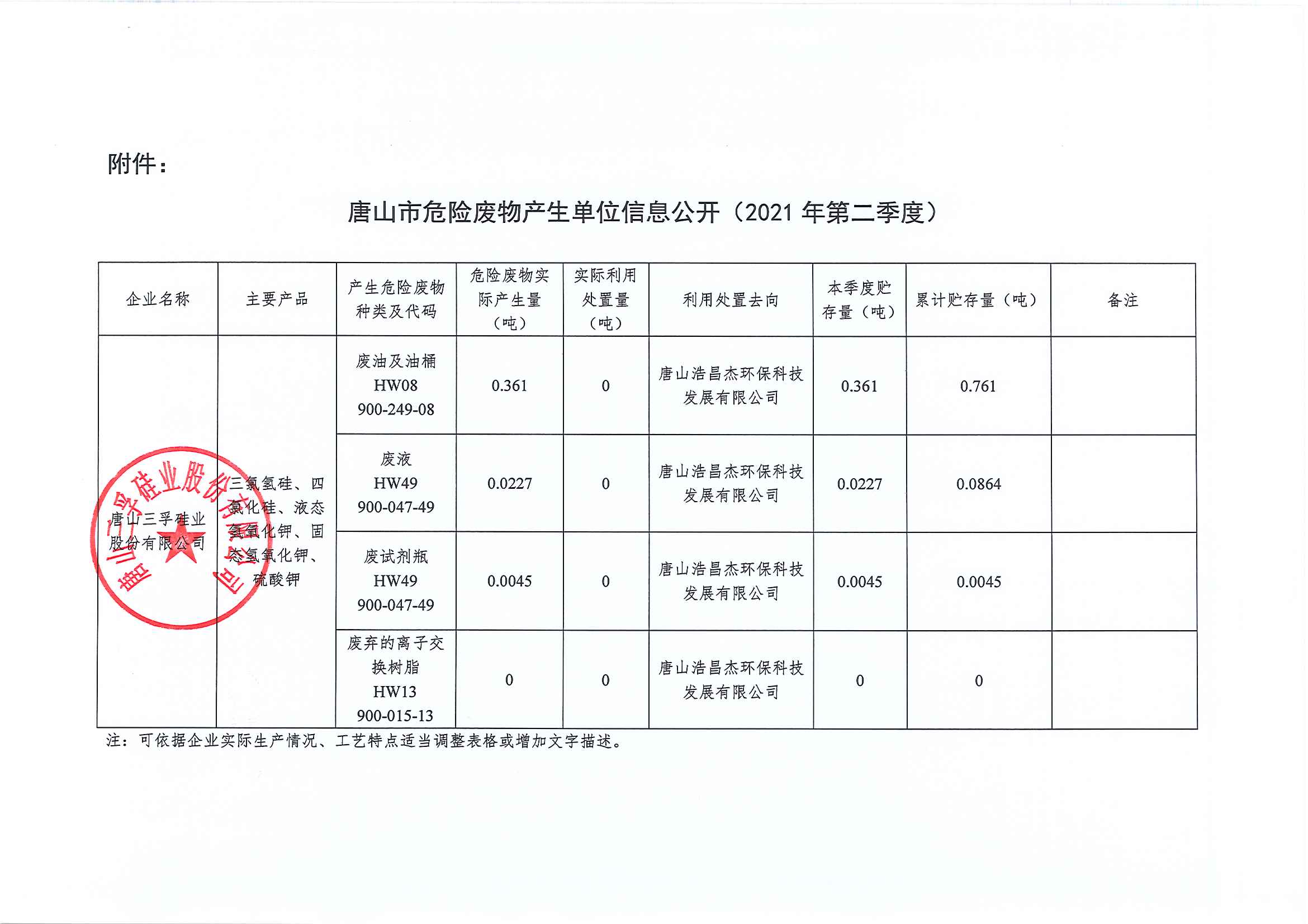 唐山三孚硅業股份有限公司 危險廢物 二季度信息公開